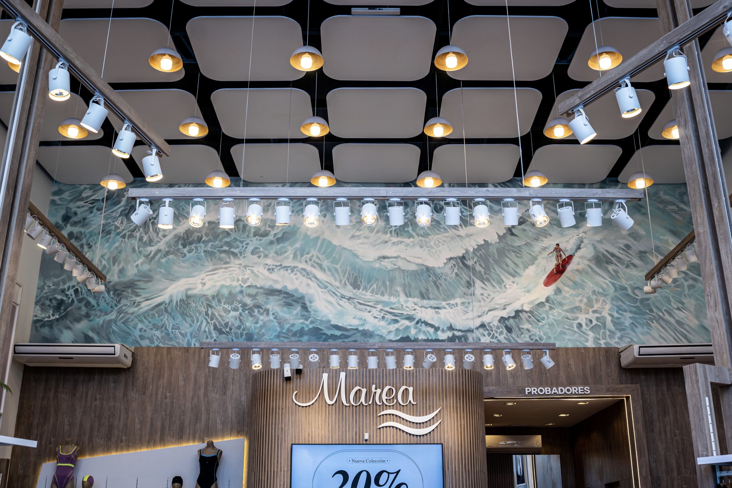 El mural en Marea funciona así: integra el universo de la marca al espacio físico. No compite con los productos, los acompaña. Genera una atmósfera que conecta la ropa con su origen simbólico. El mar deja de ser solo un concepto en el isologo y se vuelve presencia visual, algo que habita el local de manera tangible.